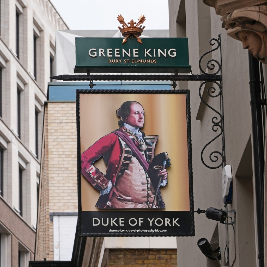 The pub pictured above I believe is in Mayfair, London. One of the more famous Duke of York’s was King Charles brother, James. According to history.nycourts.gov, Charles laid claim for New Netherland by granting James a patent to the colony. James sent a fleet of ships to New Netherland and the Dutch surrendered. The English took over New Netherland and the colony was renamed New York. I am guessing that is who is depicted in the sign, but I could be wrong. Paintings I see of him online do not resemble this sign.