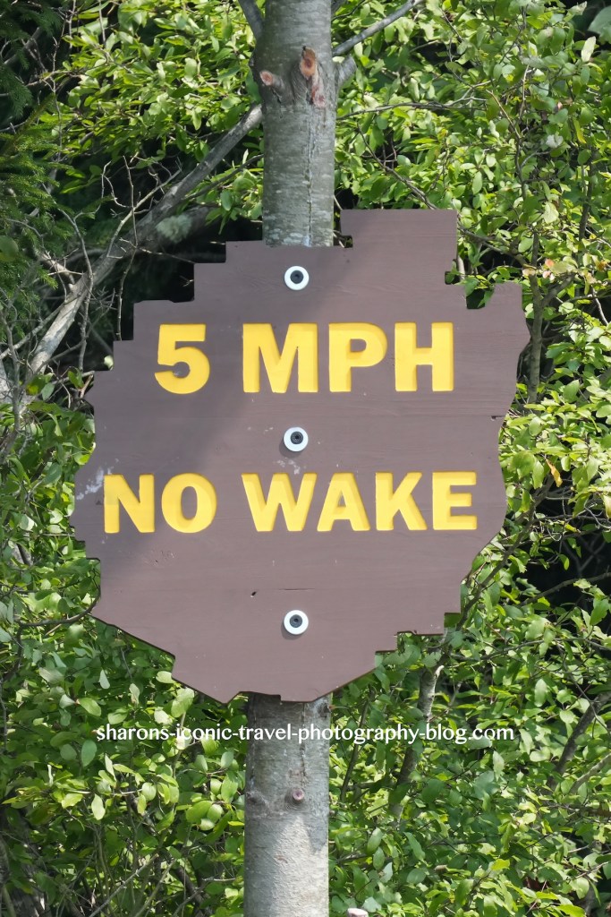 These signs are in the shape of the Adirondack Park. They had a few of these no wake signs up on the lake. All boats were slow moving that day. I was more concerned with the wind.