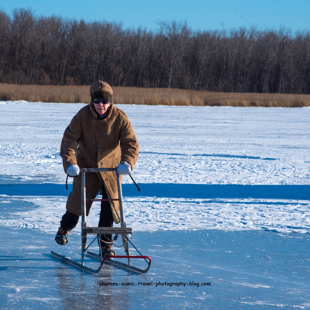 A kind of sled that goes on ice.Young and old were all enjoying the ice.