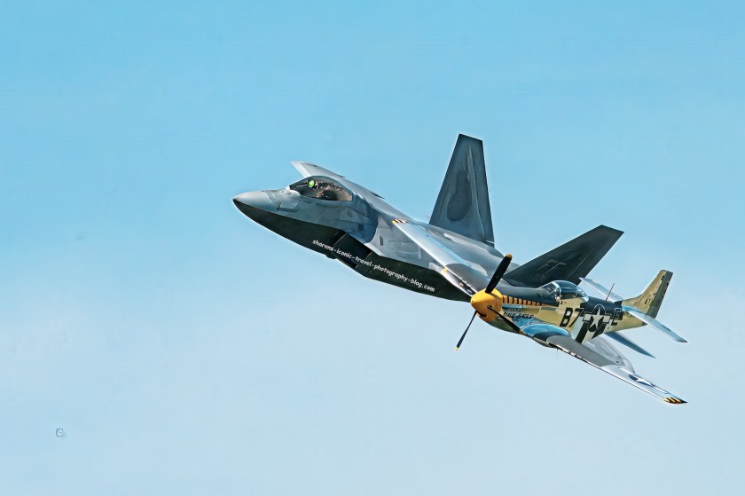 These two aircraft showed off the evolution of Air Force planes. The F-22 Raptor, a current fighter plane, is seen flying in tight formation with a P-51 Mustang. The Mustang was used in WWII, the Korean War and other situations. If you ever get a chance to see the F-22 in action, take advantage.