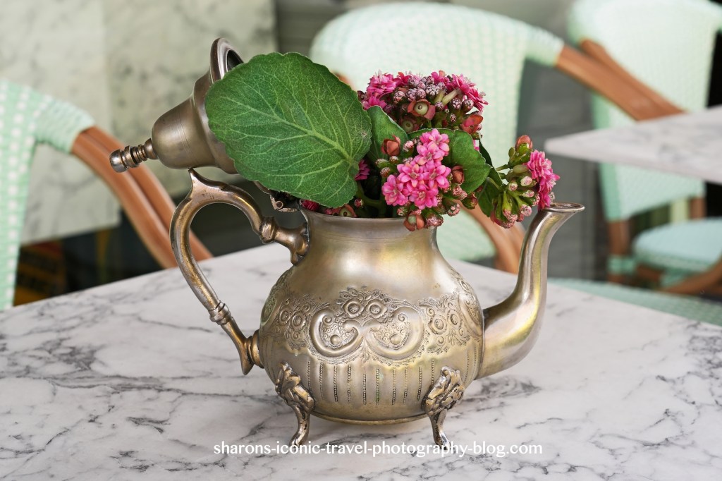 I love how they repurposed these old teapots into flower vases. It combines the British love of tea with their love of flowers.