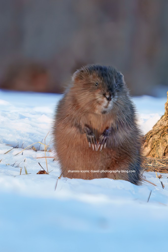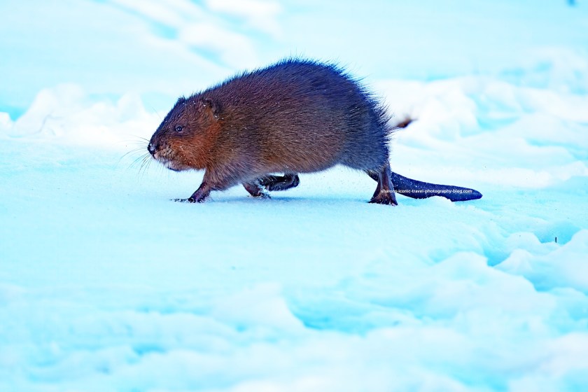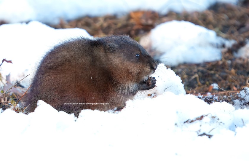 I know these creatures are in a little pond. They make sure there are holes in the ice to come up out of. I have only briefly seen them out of the holes near the pond. On the day of the photos I saw them scampering up the hill from the pond.