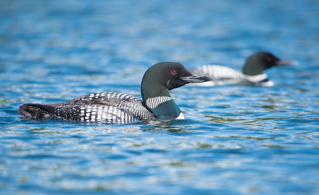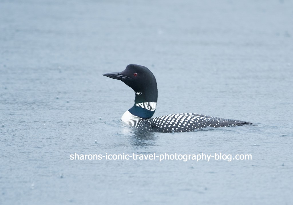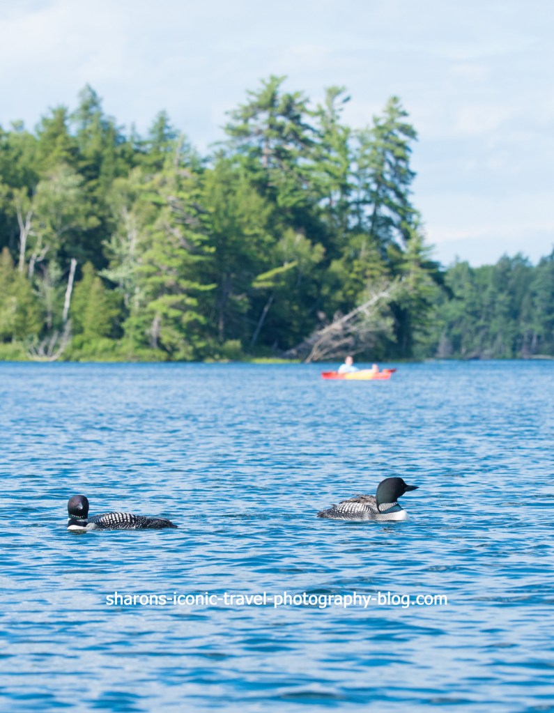 Where do you find loons? They prefer wooded lakes and ponds with large populations of small fish. They prefer lakes with islands and coves for protection. Both lakes I found them on I would not have spotted them from shore. During the day I found them fishing in the middle of the lakes. One one lake I kayaked around for almost an hour before I caught sight of a pair. On the other lake I was on a tour boat when we spotted one. The Great Lakes region has between 5,000- 7,200 pairs while New England and New York have around 2,250 pairs. Well known for having loons are the New York Adirondacks, Maine, and Minnesota, although other states also have them.