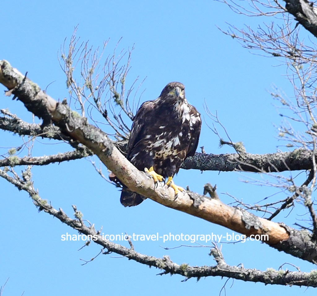 One of two juveniles. The eagles go between lakes to find food. So hungry I will eat a pine cone. These juvenile eagles (born in Spring) are at least a month or more behind the ones born along the Hudson River. I think they are born 1-2 months later. They flew but had trouble landing and in August did not fly much over water. They made no attempt to get food on their own, and the parents appeared to delay getting food for them. After one fish was dropped off the kids fought over it and the parents flew back to the nest to break it up.