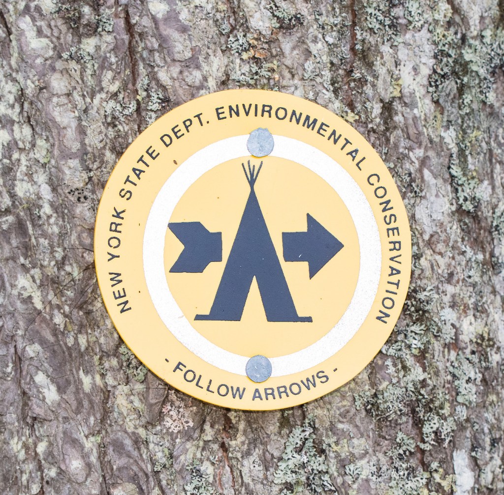 Marker on a tree pointing out campsite access locations.