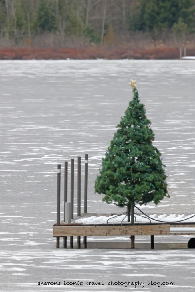 I was hoping they would turn on the lights, but they never did. Christmas tree on a dock as seen from the village of Saranac Lake.