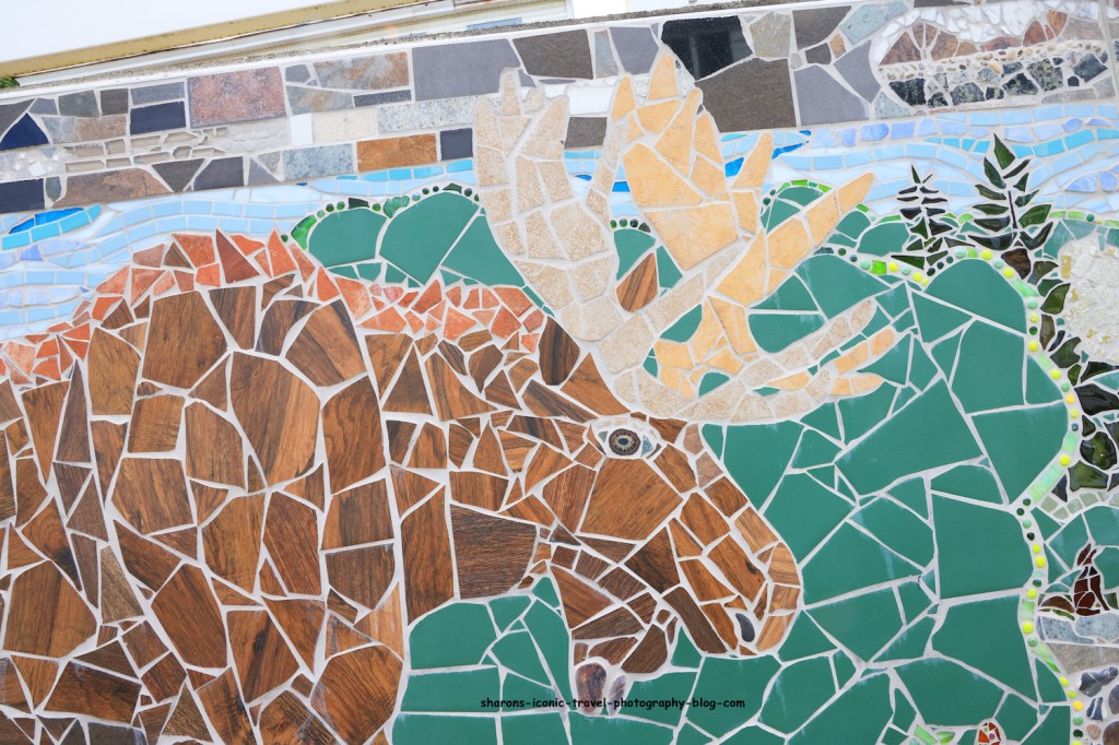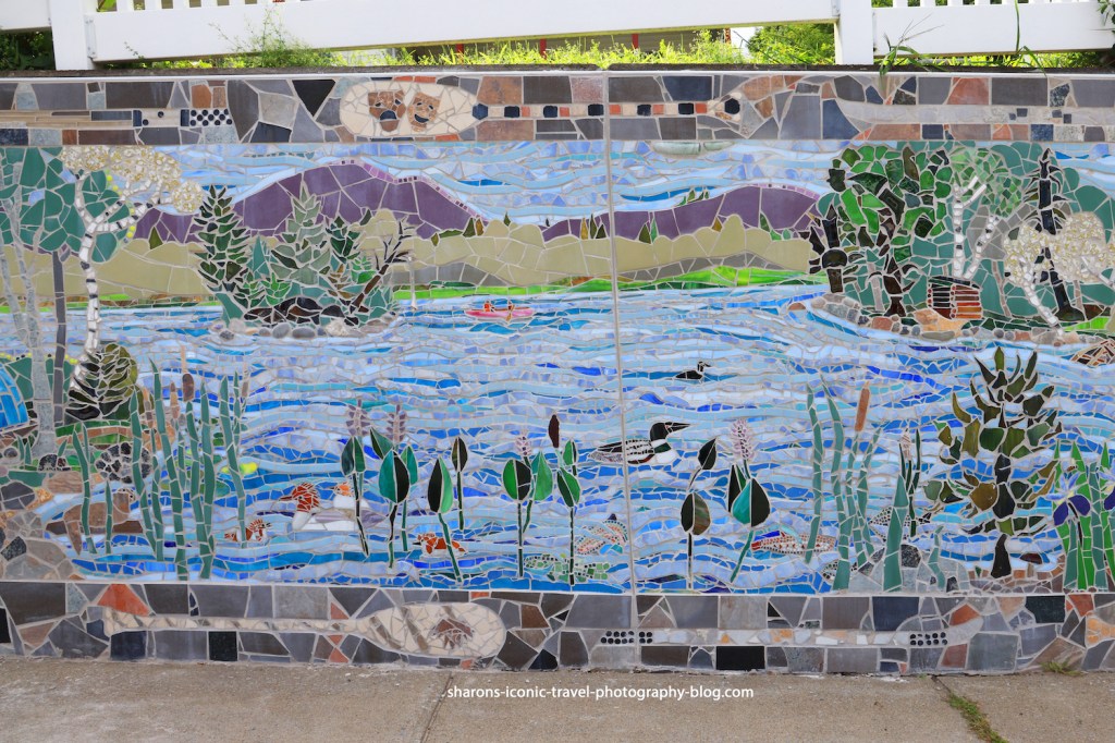This mosaic is on Main Street in North Creek. The mosaic depicts the animals and activities that make the Adirondacks what it is. It was artist Kate Hartley’s idea to turn this 180 foot concrete wall into a mosaic. She had the help of over 700 volunteers including students from the area and visitors, so this was a community project.
