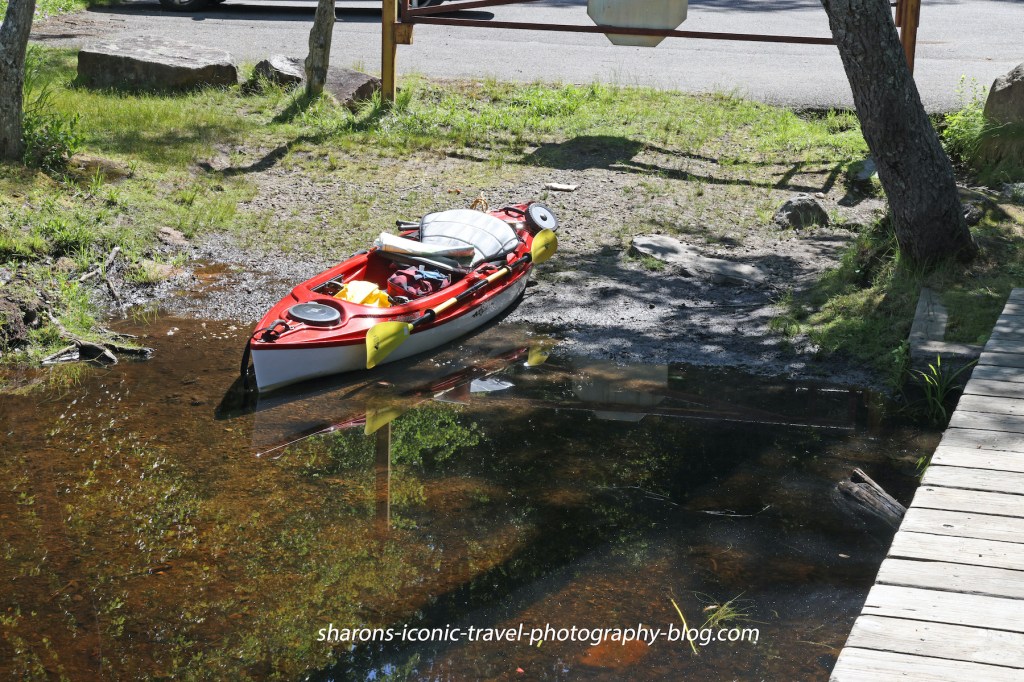 The first canoe carry I found was starting from a parking lot across from a remote location of St. Regis Canoe Outfitters. This store was out in the middle of nowhere in a house. I walked part of the canoe carry which went across a wooden path in a marshy area behind a very large beaver dam. Side note: these are some serious beavers. Unfortunately on the other side of the wooden walkway from a steep rooted incline. This is a no go for me. I went into the store and asked if the canoe carry at the other end of Long Pond was any better. They assured me it was shorter and not so steep. Before I left , just in case, I rented a canoe carrier device to put your kayak on underneath the middle of the boat. They charged me $5 dollars.