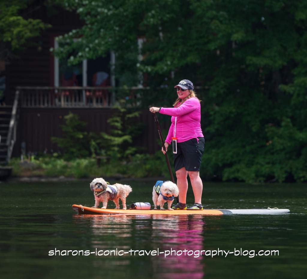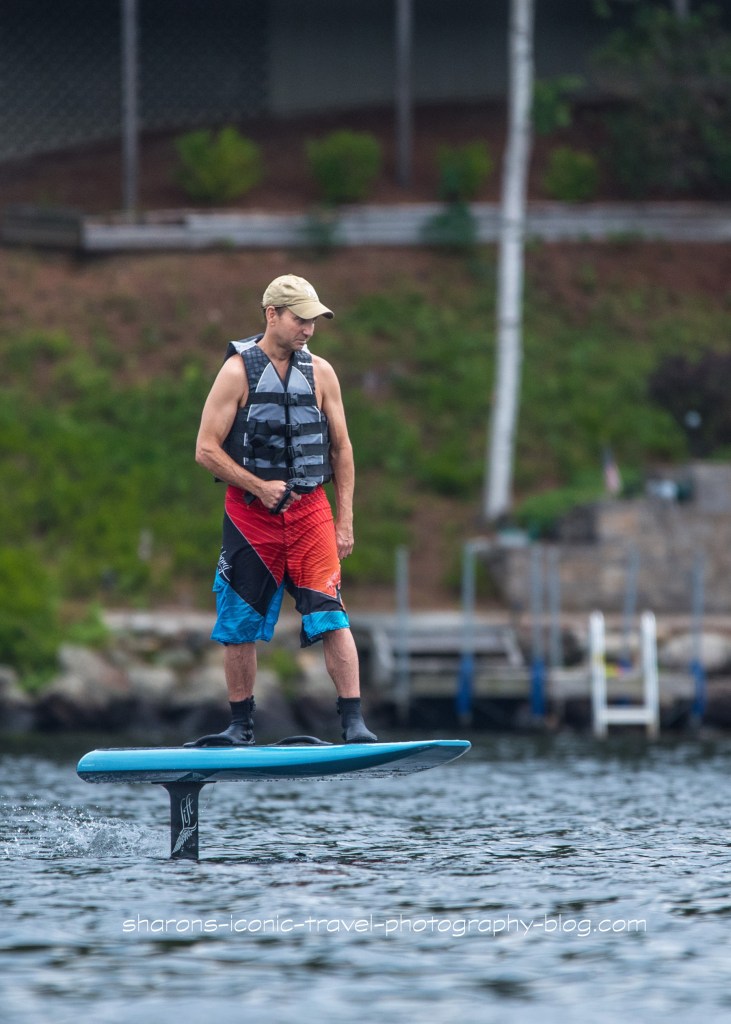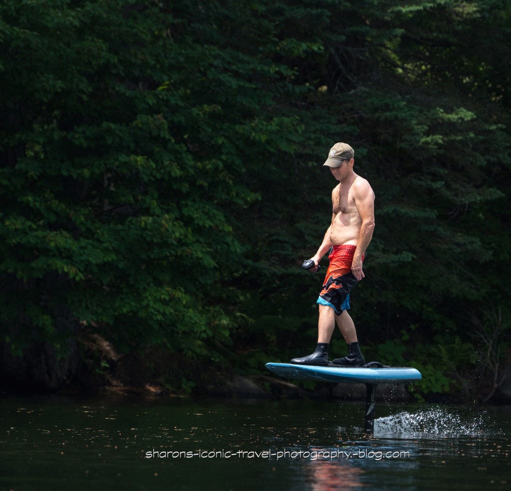 I could hear thunder the entire time I was on the lake, so I may have done less than half the lake. The thunder was in the distance, but always think of safety first.The dogs seemed to enjoy riding on a stand up paddleboard.This man zoned back and forth on the lake on a hoverboard.Arriving back at the beach. The beach is next to highway 8. The parking is right next to the road.