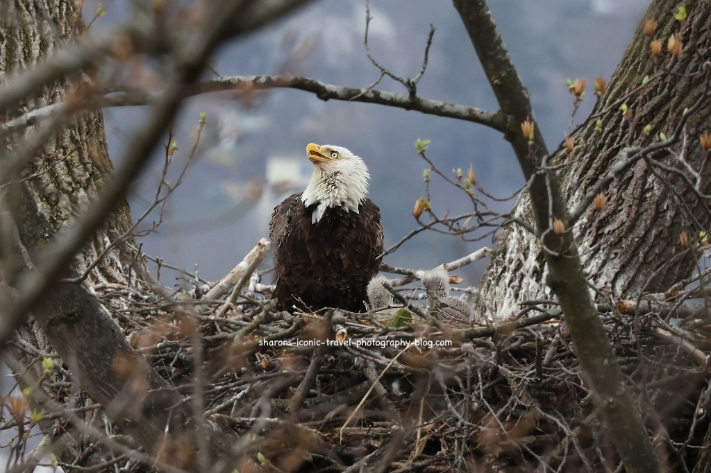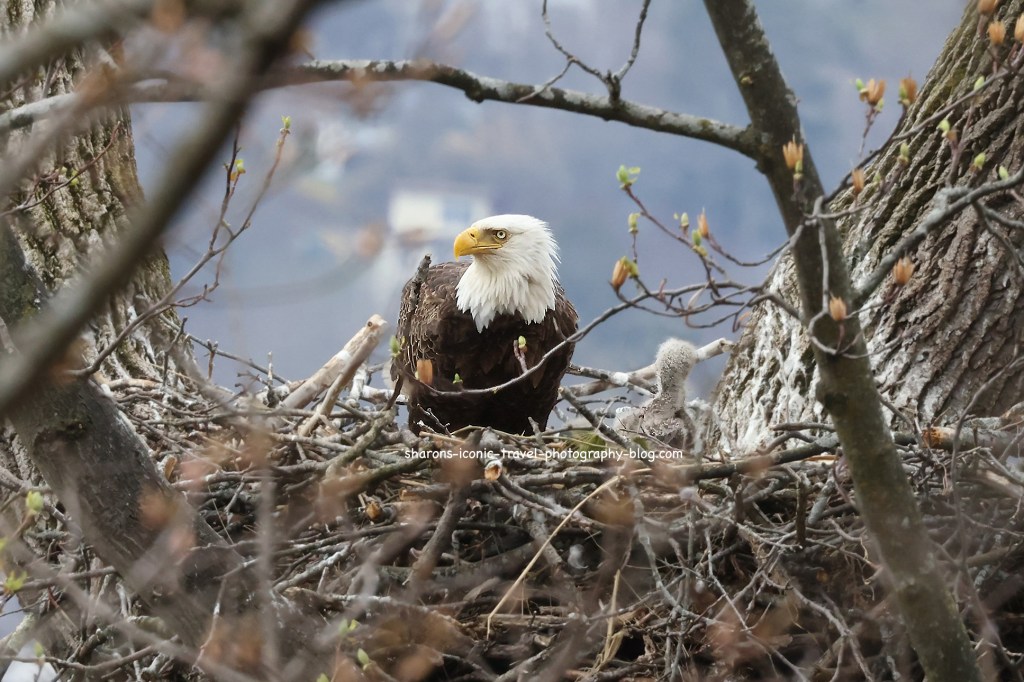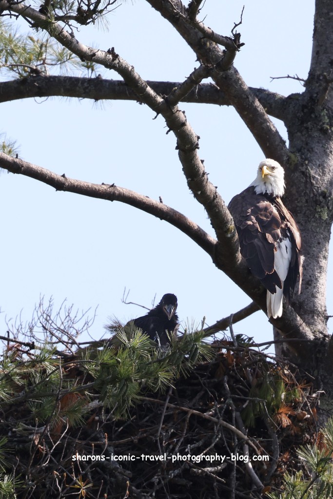 The eagles from this nest tend to grab grass from the field below and branches and sprigs from nearby trees. The parents lost an eaglet each of the last two years. Here’s hoping the three in the nest grow up to reach adulthood. The parents are keeping them well fed and are doing their part to try to keep them safe. Fingers crossed.
