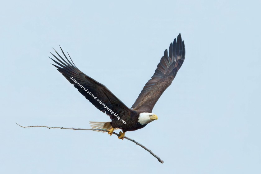 When one adult bald eagle is on nest watching duty, they at times fly nearby to grab a stick, small branch, grass, or pine sprig to add to the nest. Today was no exception.