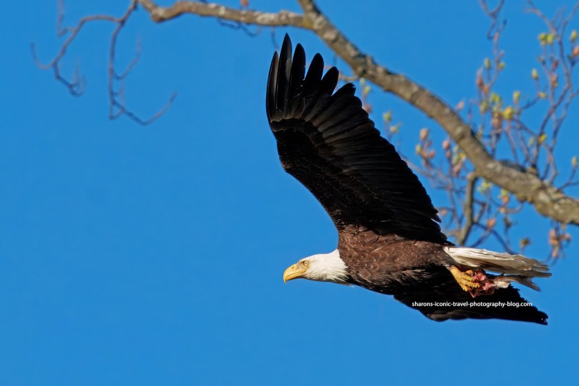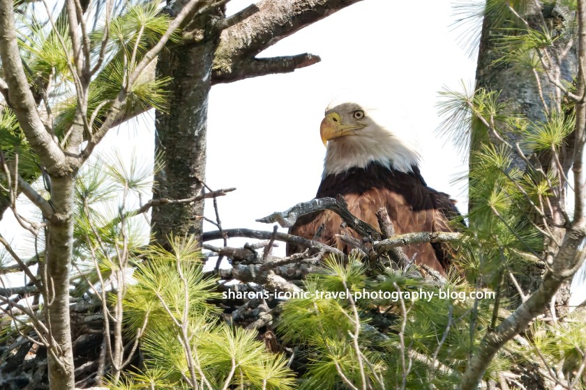When one adult bald eagle is on nest watching duty, they at times fly nearby to grab a stick, small branch, grass, or pine sprig to add to the nest. Today was no exception.