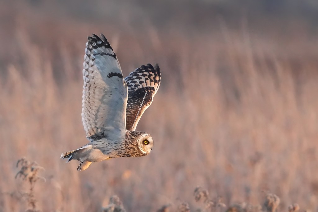 Short-eared owls are the most diurnal (active during the day) of all the northeastern owls. They are most often observed in the late afternoon and at dawn or dusk. These birds eat primarily small mammals, but they occasionally take smallbirds, and the young sometimes eat insects.