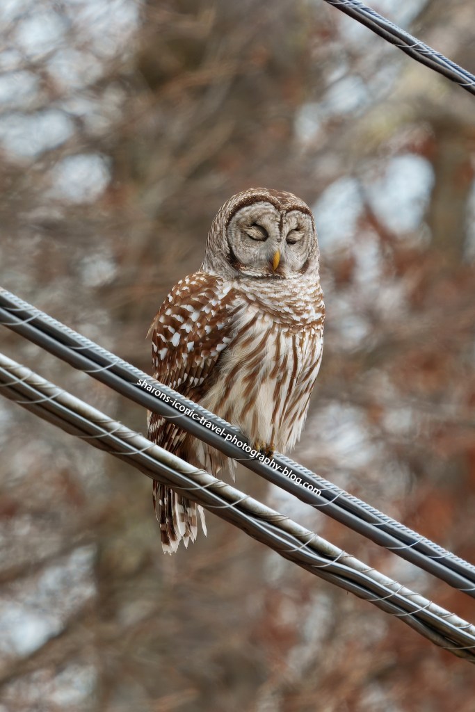 It was on private property. One of the local home owners said they see the owl on their property daily. It rested its eyes on the power lines for a short time. Sometimes they do that to fool the animals in the woods.