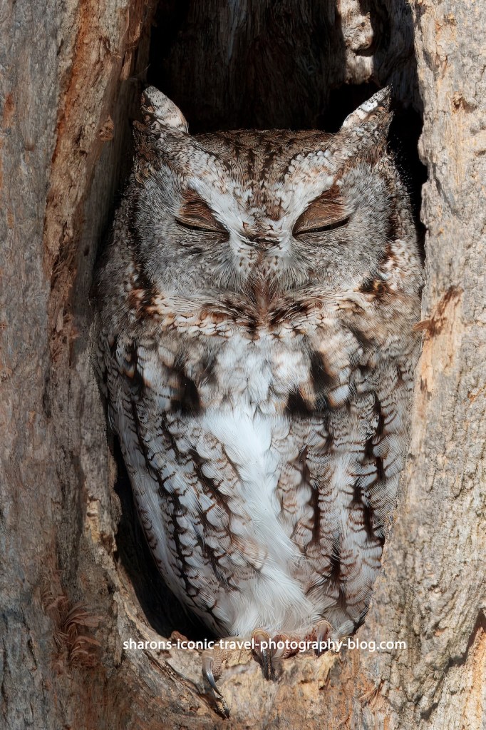This screech owl was in a tree close to a little traveled road. Cars stopping in front of the tree did not wake it. Construction vehicles, and aircraft flying around did not awaken it. Other wildlife could not rouse it. It is one heavy sleeper.