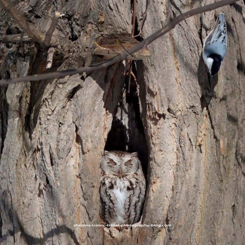 I was rooting for this bird, I think a nuthatch, to wake it up. It flew from another nearby tree and proceeded to walk down the owl’s tree towards the hole. I think it thought it was not such a good idea to go further. According to All About Birds: