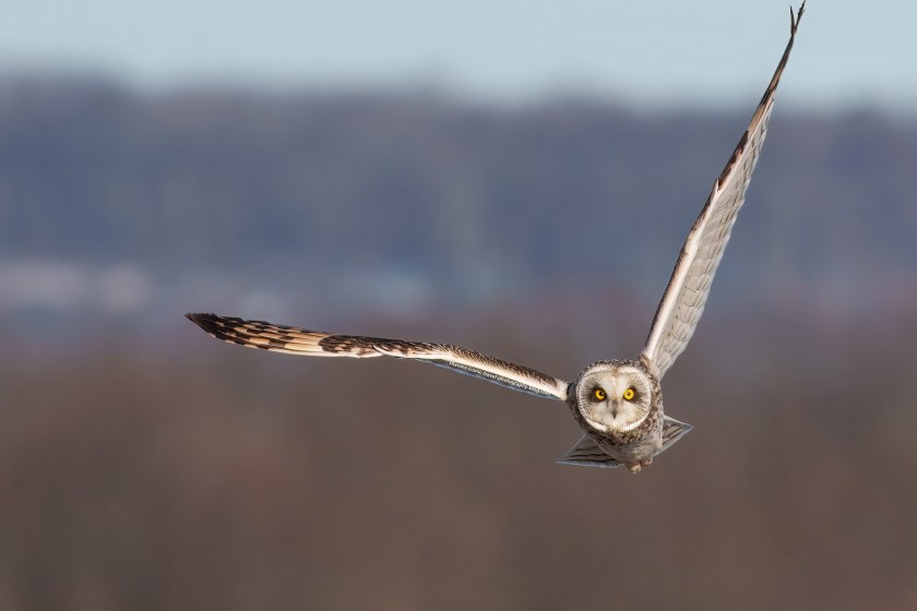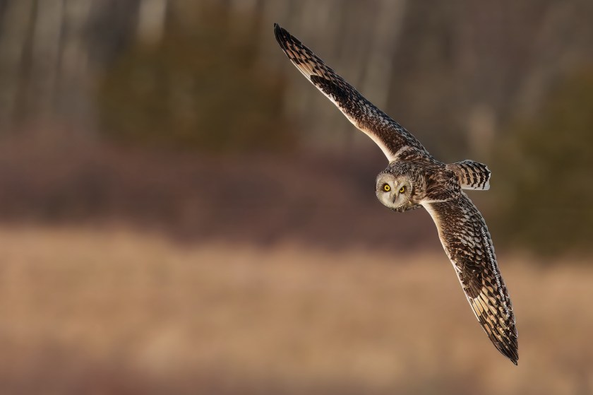 While the owls flew around one tree the hawk was perched in, I was able to get off some fly by shots.